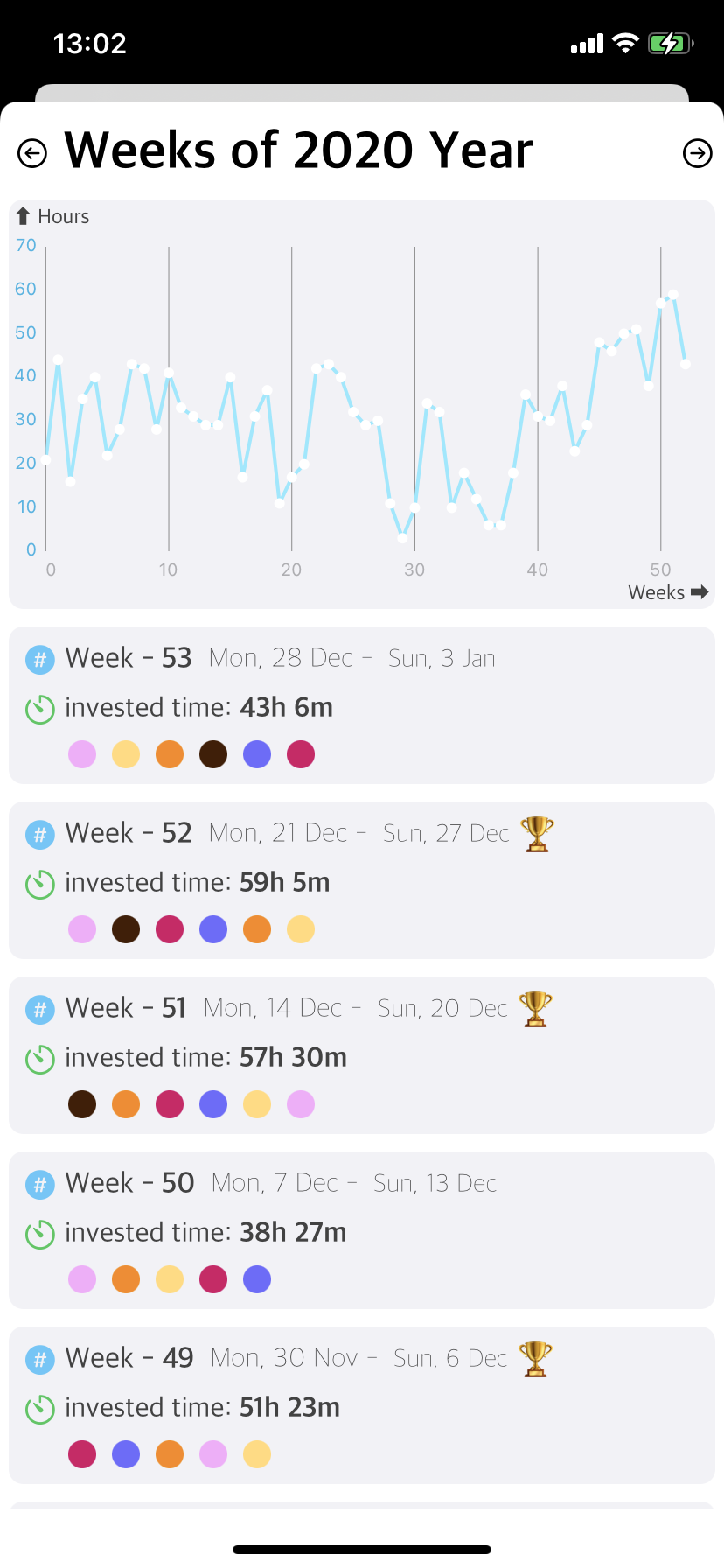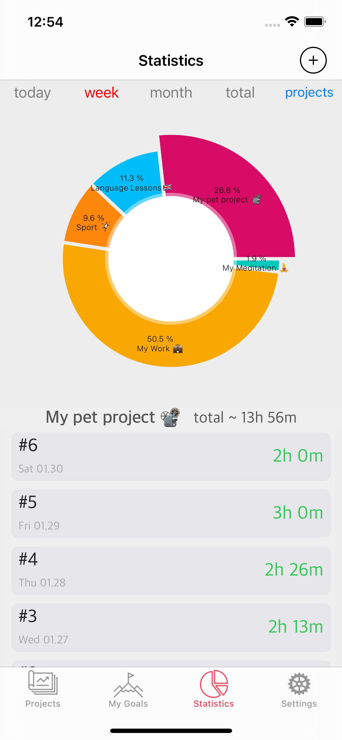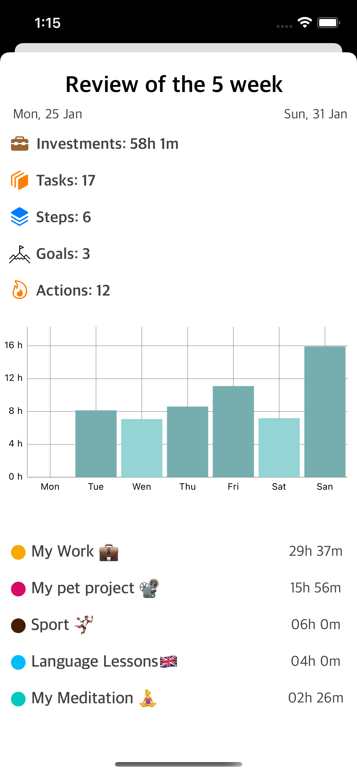 The more you track yourself, the better you understand how you manage your time. There are different kinds of statistics implemented in the app. Look at yourself retrospectively and make decisions with charts for a year, a week, and a day. The graphs show the amount of invested time, tasks done, Steps, actions.